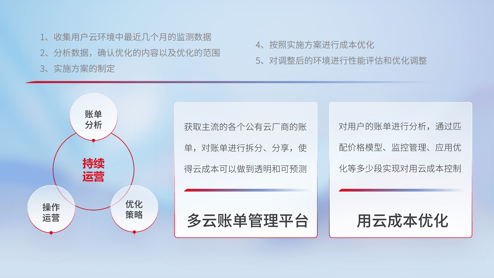 通过多云纳管,,,,以统一的资源数据模型把客户的云资源进行抽象和封装,,,进而实现对多云资源的统一操作,,,保障云资源管理的可靠性、、、稳定性与可用性。。。。量身定制化运维内容,,,,配置、、、开发运维、、补丁管理、、、、备份、、、、监控、、认证和访问管理、、、审计和日常巡检等,,,保障在用云过程中的可靠度,,,,稳定度以及高可用率。。。。